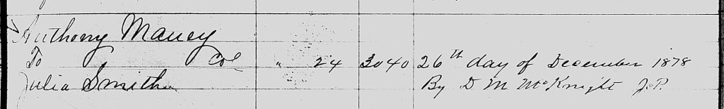 [v] Marriage Record, “Anthony Maney to Julia Smith,” Rutherford, TN: December 26, 1878, accessed December 17, 2020 from familysearch.org database, https://www.familysearch.org/ark:/61903/3:1:3QS7-L93F-MSV3?i=683&cc=1619127&personaUrl=%2Fark%3A%2F61903%2F1%3A1%3AQKHS-6H52.