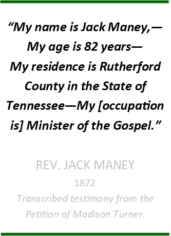 There are very few records known for Jack Maney. Information known about Jack Maney comes from oral histories and court records. It is unknown where Jack was enslaved prior to emancipation. In 1872, Jack Maney stated that he was 82 years old.[i] In an interview given by Wesley Maney, Wesley recounted that Jack Maney was owned by Dr. James Maney (“Newt Maney’s grandfather”).[ii] This claim is not supported by the 1860 census records, so it is difficult to determine when Jack Maney was enslaved by Dr. James.[iii]