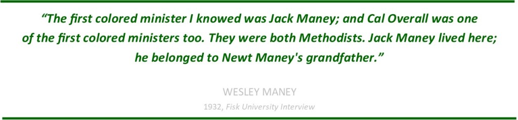 Wesley also stated that Jack Maney was the first African American minister that he knew in Murfreesboro, Tennessee.[iv] Jack was a Methodist preacher but was not allowed to baptize his congregants while he was enslaved.[v] Following the Civil War, Jack proclaimed his profession as being “a minister of the Gospel.”[vi] It is unknown where Jack preached following the Civil War or where he lived upon emancipation. There are no further known records for Jack Maney.