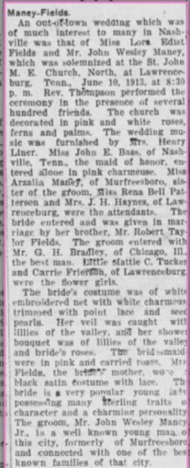 [xv] Marriage Notice, “Maney-Fields,” The Nashville Globe, Nashville, TN, June 20, 1913, accessed October 19, 2020 from ancestry.com database, https://www.newspapers.com/image/174033891/?article=7b439488-fb46-4a1a-a27d-98db8d163947&focus=0.17981628,0.37709704,0.3325815,0.62132233&xid=3398.
