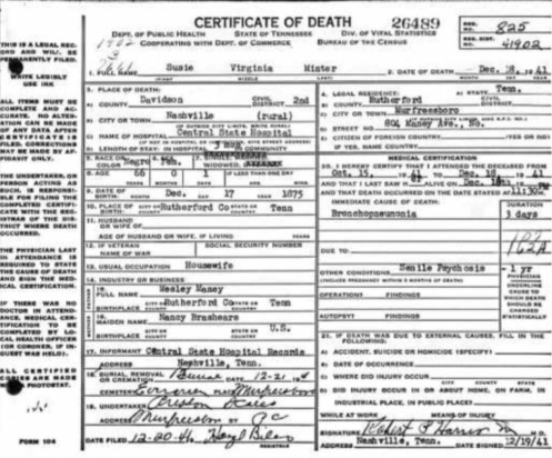 [xxv] Death Certificate, “Certificate of Death: Susie Virginia Minter,” Tennessee State Records, accessed August 28, 2019, from ancestry.com database, https://www.ancestry.com/interactive/2376/33113_258078-01662?pid=1170958&backurl=https://search.ancestry.com/cgi-bin/sse.dll?indiv%3Dtry%26db%3DTNDeathRecords%26h%3D1170958&treeid=&personid=&hintid=&usePUB=true&usePUBJs=true&_ga=2.117014405.2099567594.1566999984-1883762117.1566309872.