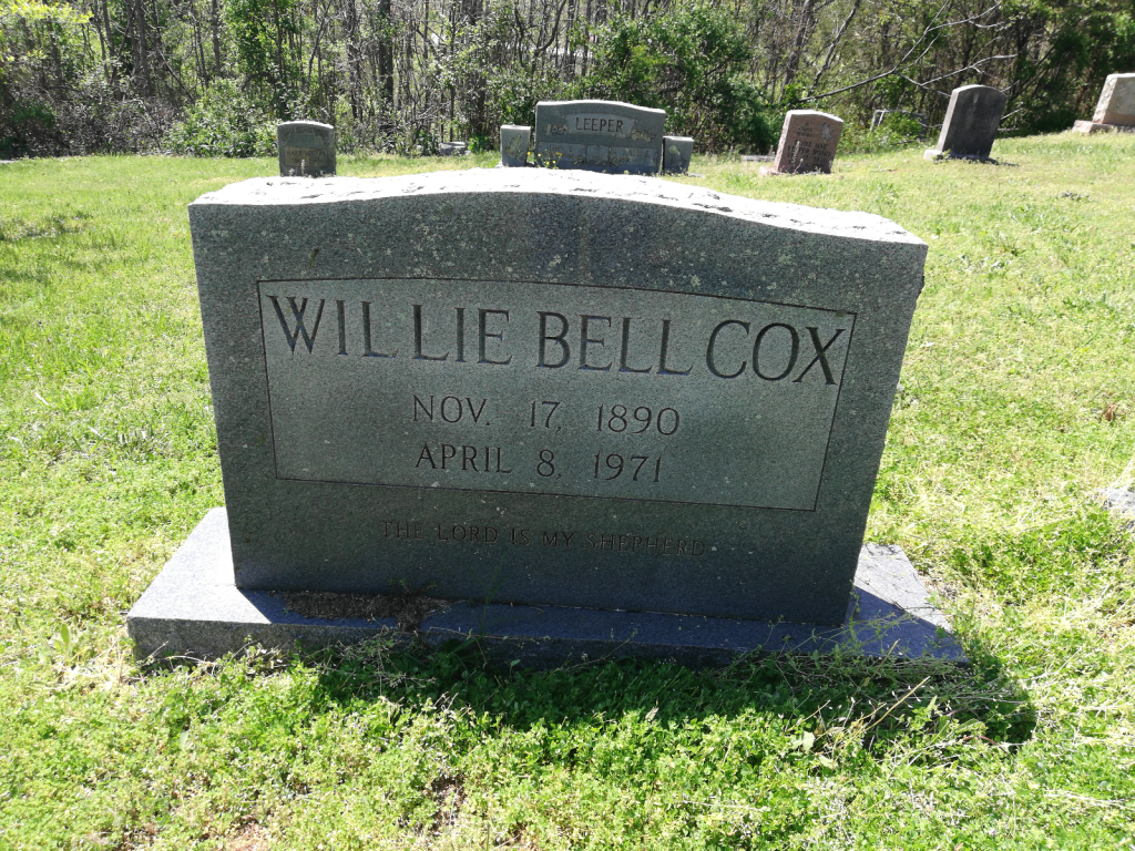 Willie Bell was the second daughter of Levinia (Maney) and John Bell.[xxvi] Willie lived with her mother through 1900 and was unemployed.[xxvii] There are few records for Willie Bell. By 1930, it appears that Willie Bell married Homer Cox and lived in Hawkins, Tennessee.[xxviii] Willie was unemployed and did not have children, and Homer worked as a general laborer.[xxix] It is unknown when Willie and Homer married or when Willie moved to Hawkins, Tennessee. By 1940, Willie and Homer were still living in Hawkins, Tennessee.[xxx] Willie and Homer owned their home, and both maintained their employment positions.[xxxi] Homer committed suicide on April 19, 1963 and was buried at New Canton Cemetery in Church Hill, Tennessee.[xxxii] Willie Bell Cox died on April 8, 1971 and was buried at Lyons Chapel Cemetery in Church Hill, Tennessee.[xxxiii]