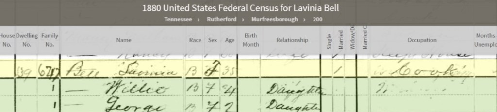 [viii] United States Census, “Bell, Lavinia,” 1880 United States Census, 1880, accessed December 16, 2020 from ancestry.com database, https://www.ancestry.com/imageviewer/collections/6742/images/4244656-00449?treeid=&personid=&hintid=&queryId=ca761ca109b4e4b1a12061ccfd116e88&usePUB=true&_phsrc=Kxs1966&_phstart=successSource&usePUBJs=true&pId=9980870.