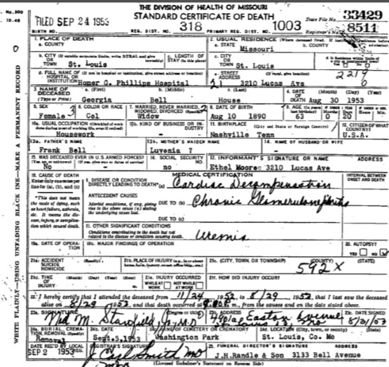 [xxv] Death Record, “Georgia Bell House,” St. Louis, MI: August 30, 1953, accessed December 16, 2020 from Missouri State database, https://www.sos.mo.gov/images/archives/deathcerts/1953/1953_00033423.PDF.