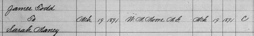 [xvii] Marriage Record, “James Todd to Sarah Maney,” Rutherford County, TN: March 19, 1891, accessed November 6, 2020 from familysearch.org database https://www.familysearch.org/ark:/61903/3:1:3QSQ-G93F-MQSF?i=382&cc=1619127.