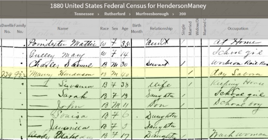 Louisa Maney was the daughter of Lovena and Henderson Maney.[xxx] There are no known records for Louisa Maney beyond the 1880 census.