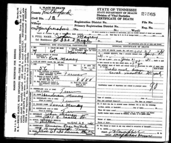 [xxix] Death Record, “Certificate of Death, John Maney,” Rutherford County, TN: November 27, 1931, accessed November 6, 2020 from ancestry.com database https://www.ancestry.com/imageviewer/collections/2376/images/33113_257957-00070?treeid=&personid=&rc=&usePUB=true&_phsrc=Kxs1614&_phstart=successSource&pId=408849.